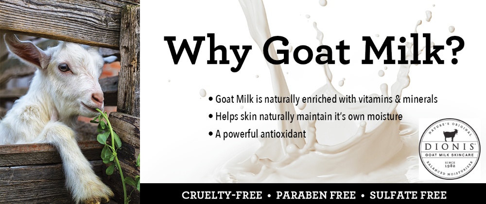 Our products are packed with vitamins & minerals naturally found in Goat Milk to nourish, condition and leave skin feeling hydrated and revitalized. Goat milk is naturally enriched with high amounts of protein, fat, iron, Vitamin A, B6, B12, C, D, E and more. Dionis products are Made in the USA!
